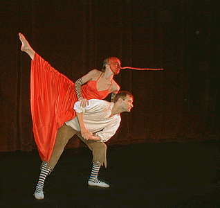"La Musette Rouge" (2001) Choreography by Sarah Morrison Performed by Sarah Morrison, Mark Kmit, and Joseph Milan Original accordian music composed and played live by Mark Kmit and Joseph Milan Mask design by Scott Radke Costume Design by Sarah Morrison Inspired by the drawings of Scott Radke